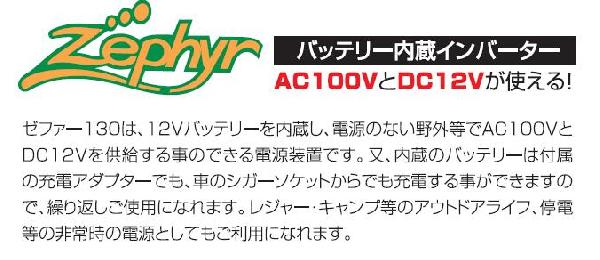 アウトドアの必需品!!■特長ドライブに・オートキャンプに、野外パーティーに、マリンレジャーに、フィッシングに、日曜大工に、非常用の電源に!●出力電圧:AC100V(50/60Hz切替式)DC12V●AC100V最大出力容量:130VA(5分間)●AC100V最大出力容量:80VA●AC出力波形:方形波●DC12V出力容量:7A/84VA●内臓バッテリー:小型シール鉛蓄電池 DC12V 6.5Ah●重量:6.0kg